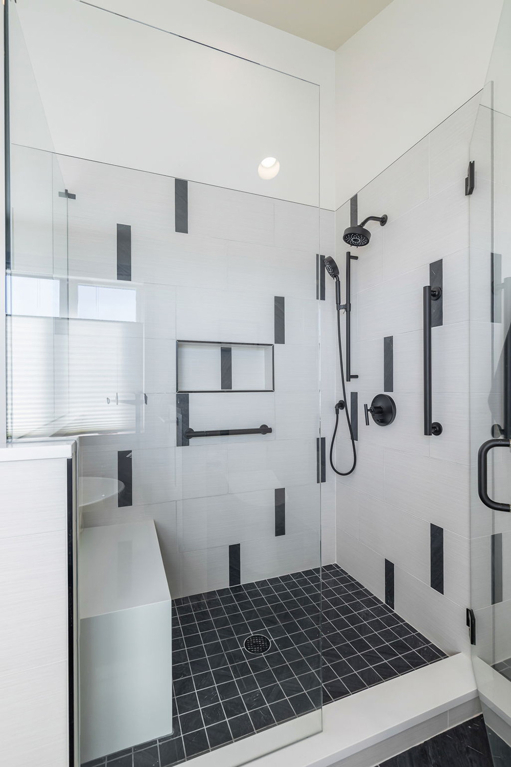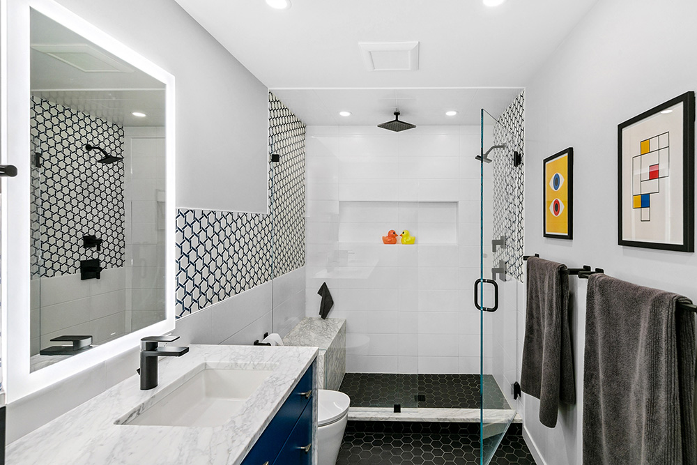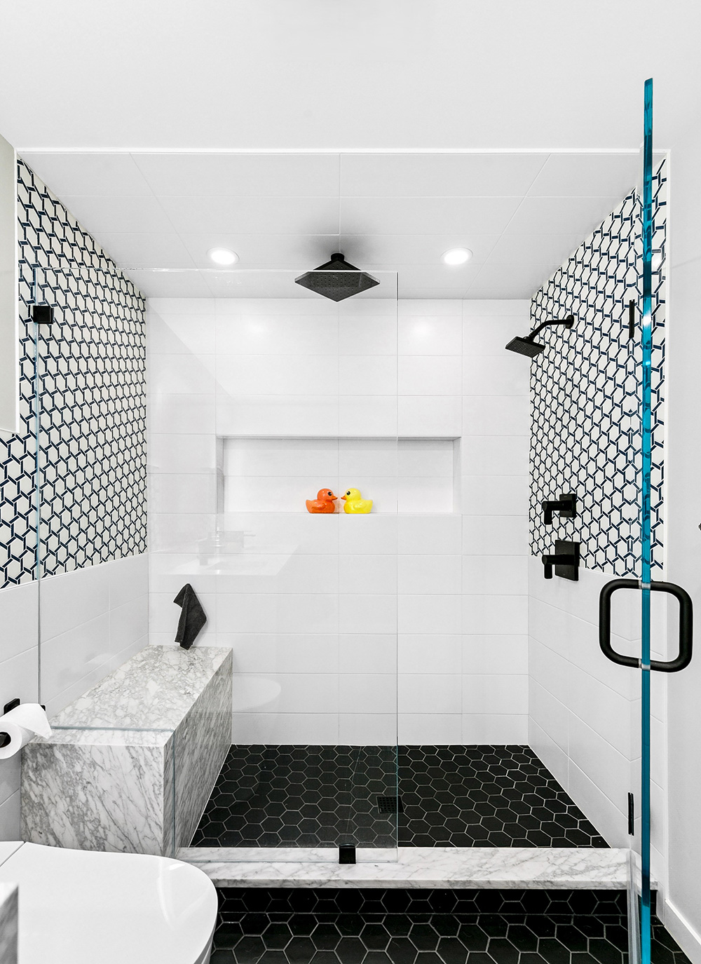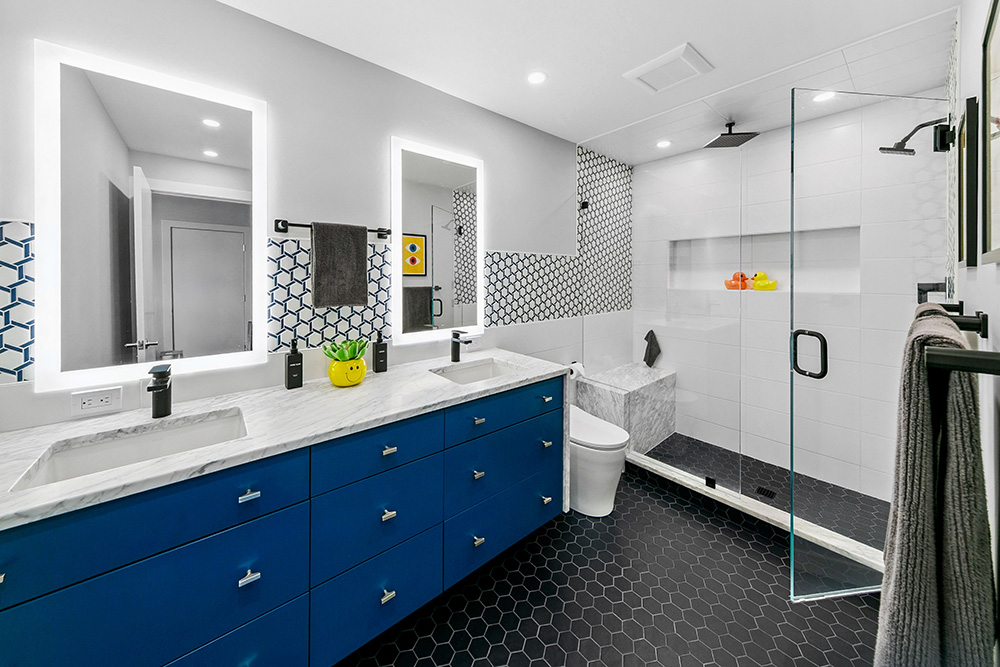 Full gut bathroom remodel, lux and loud in all right ways. During demolition, we found unexpected square footage and were able to increase the shower footprint and that was one of those sweet surprises! The new palette features striking Japanese black hexagon tile, grounded by pinwheel mosaic walls that flirt with geometry. We balanced the vibe with large-format solid white tile for contrast and calm. Delicious Crema Delicato Marble counter top with floating waterfall, custom monolithic matching marble shower bench, over sized rain shower head in black matte to match the rest of the plumbing, mirrors with integrated led light and a custom vanity painted to match the blue accent in the pinwheel. The details you don’t see: the floors are heated, the vanity has maximum storage and the lighting in the bathroom is perfect, due not only to the can lights and integrated light in the mirror, but to the perfect paint color.