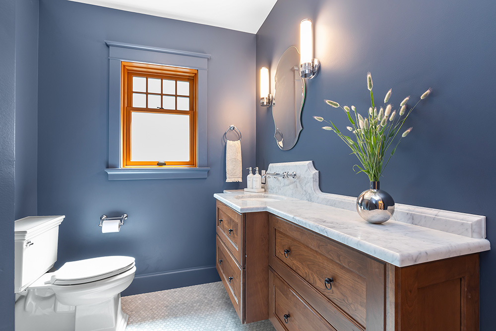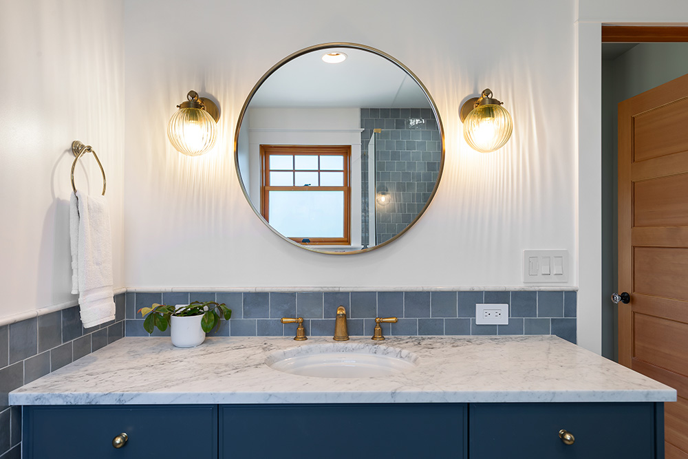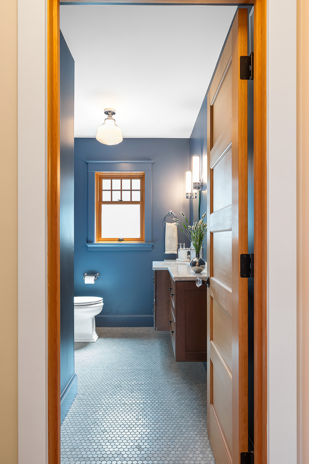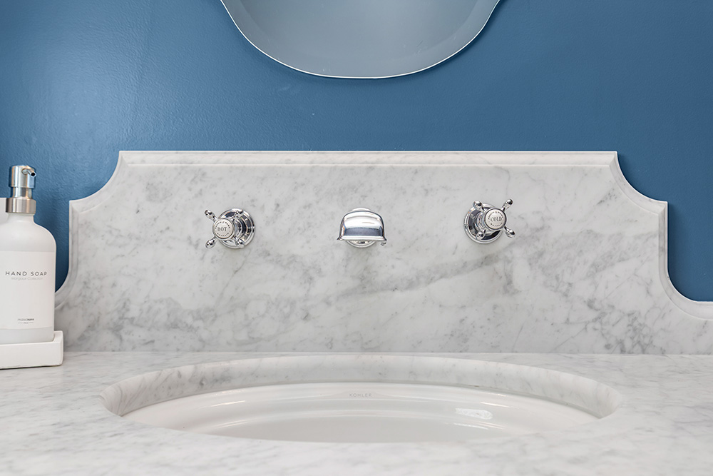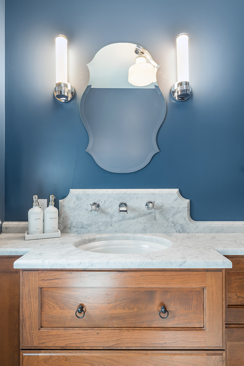 A touch of old and a touch of blue. I love the dark rich wood floating cabinet, I designed it to be reminiscing of a reclaimed Italian farm style piece, that marry so well with this Seattle home. The floor is a Carrara hexagon, just like the counter tops. The backsplash and sink edge details together with the plumbing are very refined and elevate the entire design.