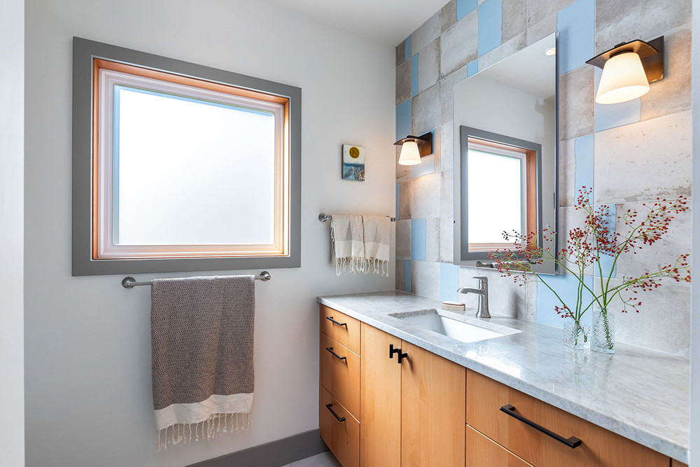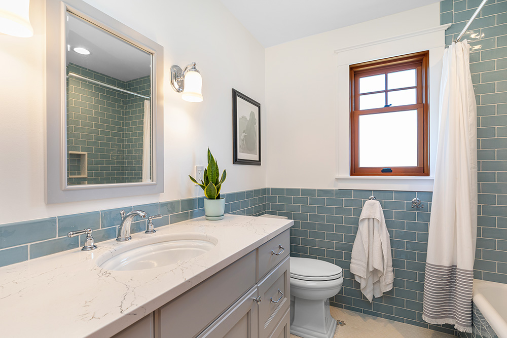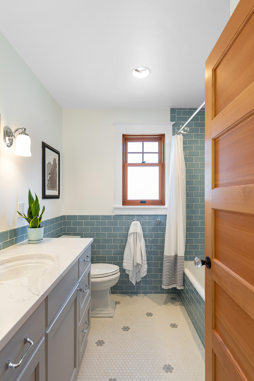 I love wainscoting! Not only helps with cleanability (and this being the children’s bathroom can certainly use it), but treating dry walls with tile adds so much more interest. In this case, the wainscoting in tile is what tie the entire room together. A bright aqua blue tile hue paired with white and pale gray, makes a very suiting pallet. The fir wood at door and windows, add warmth.
