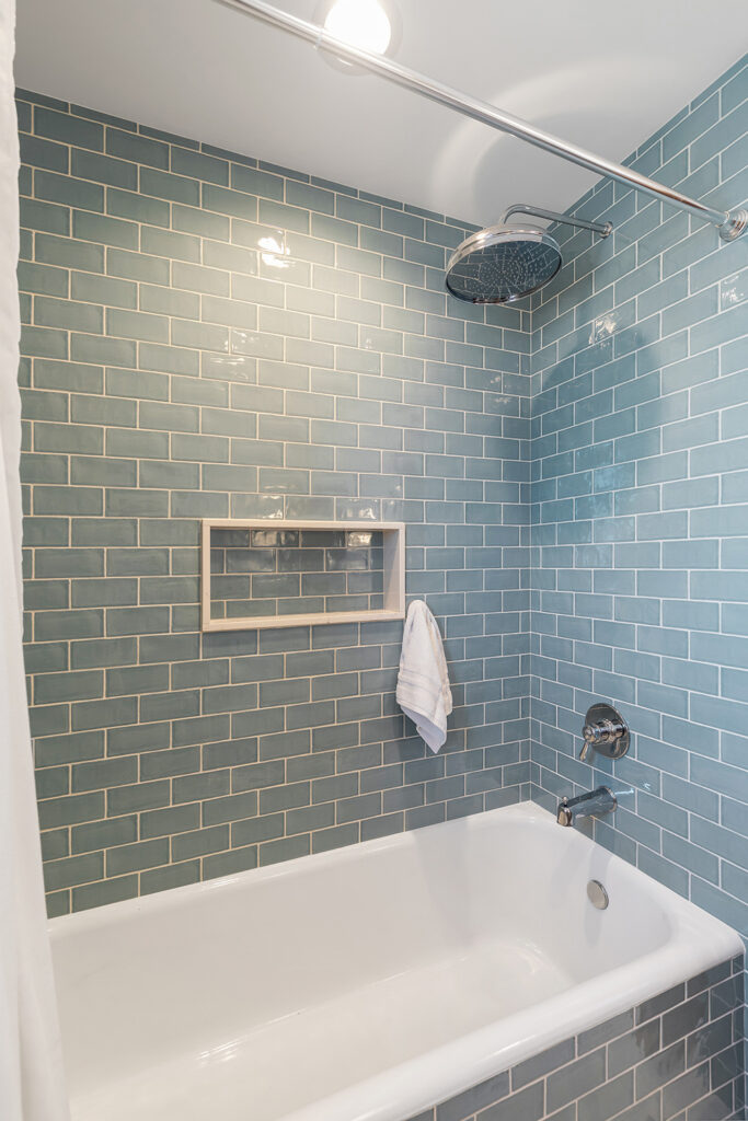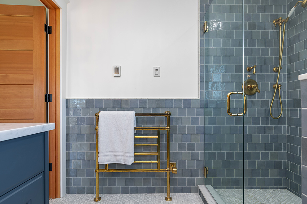 I can’t get enough of this Zellige blue tile! That retro` feel with modern details, I just love it together! The brass plumbing is a great complement to the blue and the white floor and counter tops with floating waterfall provide the needed contrast. Where you see the shower, there used to be a tub, we opened the space without changing the drain location. Storage was increased with better doors at the linen closet and open shelves in the shower back niche.