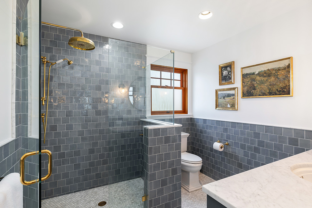 I just can’t get enough of the Zellige Tile! The point of green of the ceramic wainscoting is deep luxurious and it has enough variation to look weathered and so it fits the application in this historical home. The floors and the shower upper walls are Calacatta Marble hexagon mosaic, the tile is framed with gold trims. The pedestal vanity shows off the tile behind, and the metal combination is unexpected. I do love the Chinoiserie paintings on the wall, framed in a rich wood frame. The point of green matches precisely the tile and brings the room together. It’s hard to tell from the finished pictures, but the most difficult part of the job, was to frame and re-frame the walls to accommodate the very unforgiving tile design (yes… mine…). Props to the VCG team!
