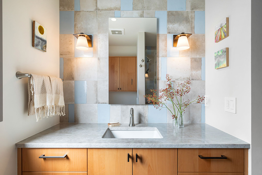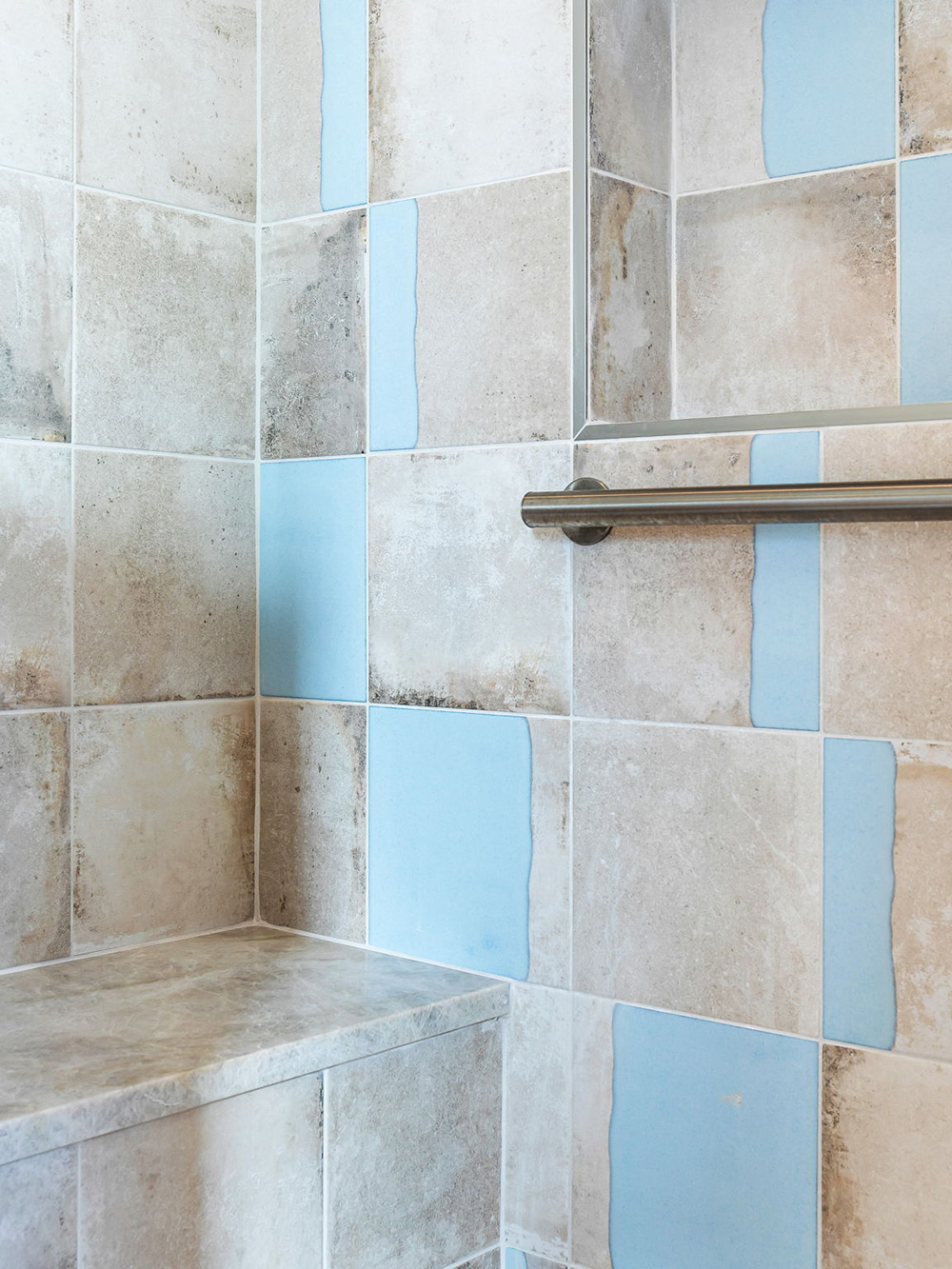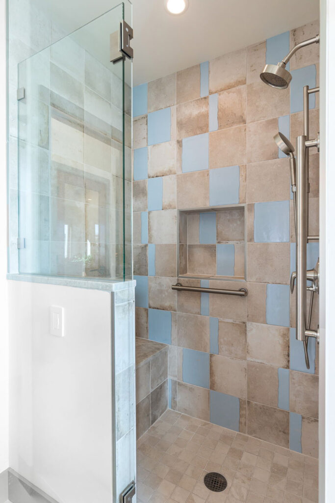 My client fell in love with the wall accent tile. The contrast of the warm concrete look and light blue varnish that looks almost like a paint spill, is what she liked about it. The tiles have 6 different designs, and I wanted a cohesive look that enhanced the tile without looking busy. The lay out design was difficult, but worth it! We finished off with a neutral Brazilian Quartzite on the counter and shower bench, wood cabinet and beautiful sconces that bring back an Asian theme consistent throughout the house.