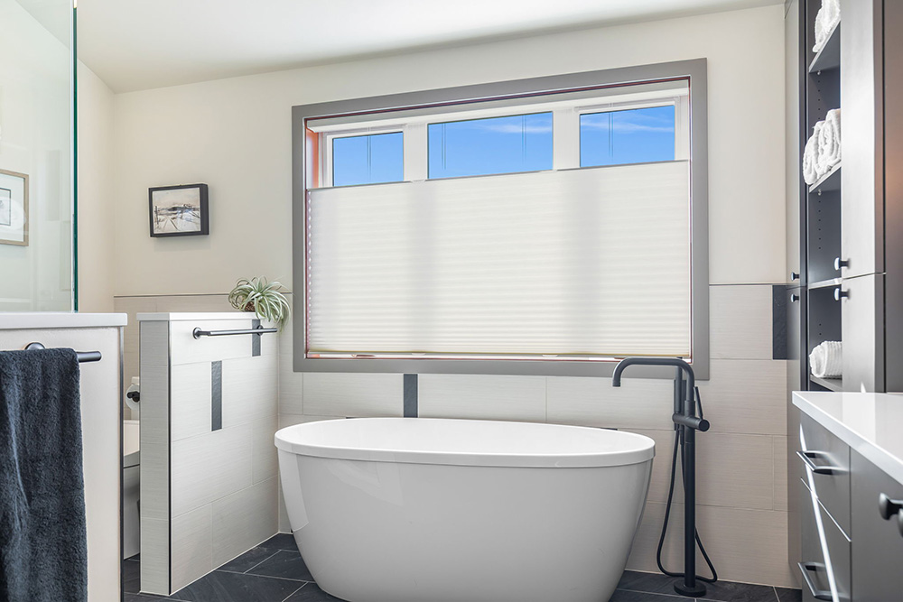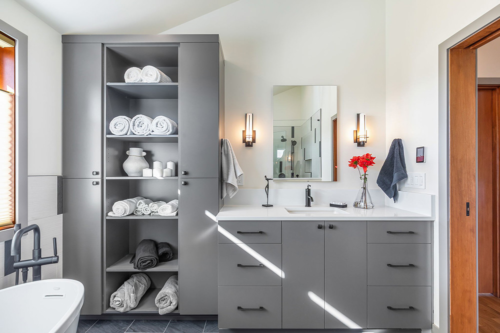 Comfortable, practical, clean with a lot of storage. This bathroom was a complete addition. I started from the tub location. I wanted to open the pocket door and have the tub centered under the window with a sleek tub filler. We have symmetric pony walls, one in front of the other, one provides privacy for the toilet area, the other one privacy for the shower. The rhythmic pattern of the black lookalike slate accent on the walls gives a little movement to the design. Again, for this home, a little Asian influence in the overall look and light selection. Heated tile floor and medicine cabinet with integrated outlets, USB & C are some of the perks you can’t see from the pictures.