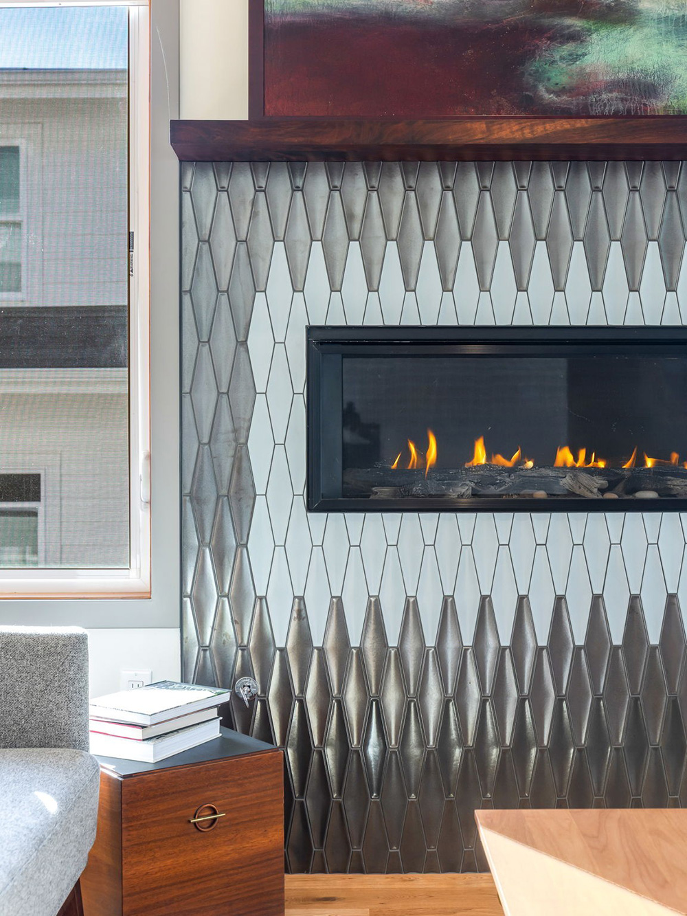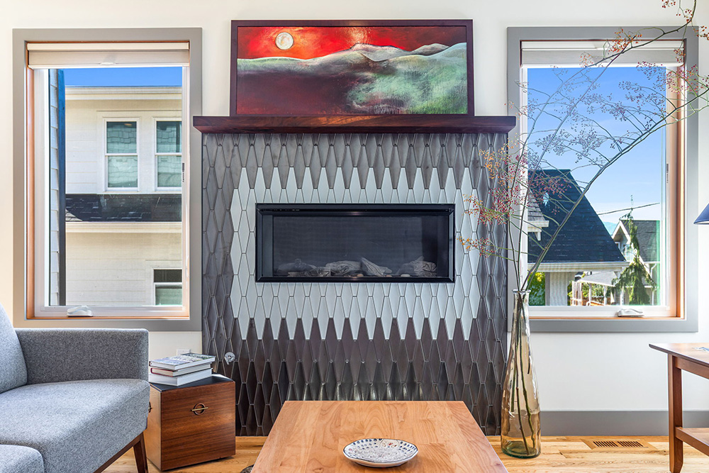 The eclectic nature of the owners shines in the design of the fireplace and furniture choices. The PNW cape cod cottage has maintained many wood elements and incorporate new metal details and Asian touches. The owners already collected several Asian art pieces, and as an homage to it, we used a handmade Japanese tile in 3 different colors, that rather than hide the fireplace existing location -higher than usual- it enhanced and embraced it. Designing this fireplace tile layout was challenging, and I took several stubs at it. I did not want anything banal or symmetric, I wanted something different, with an hombre look focusing on the fireplace mouth. We all liked the result!