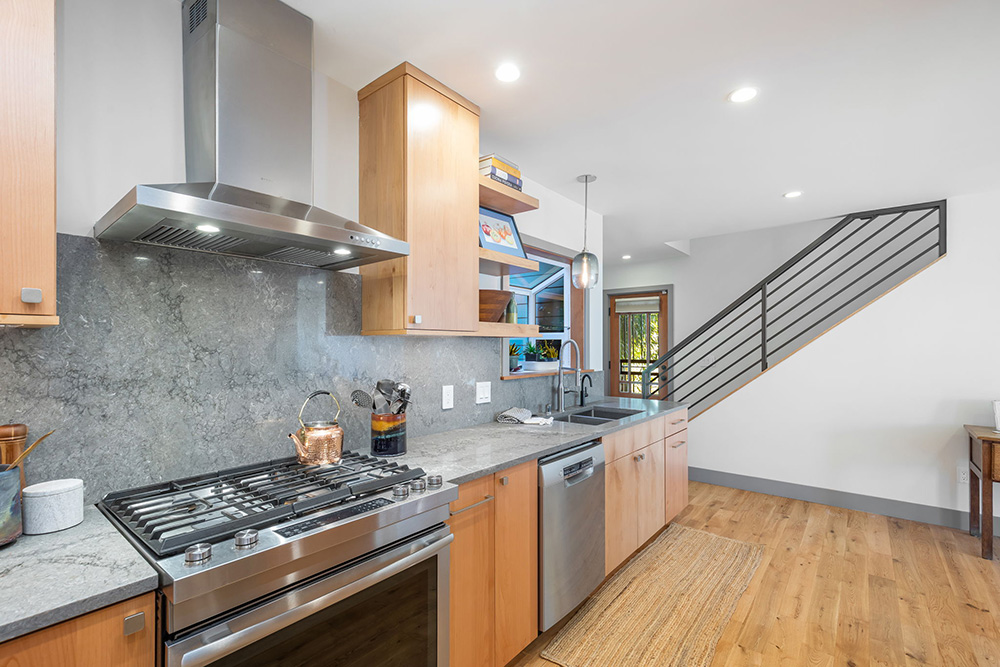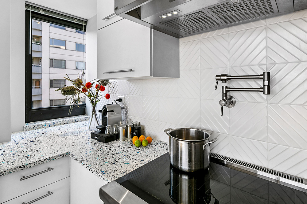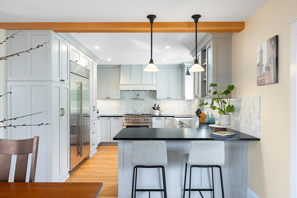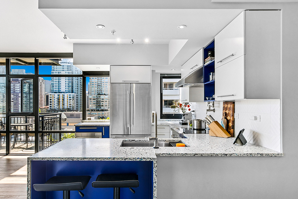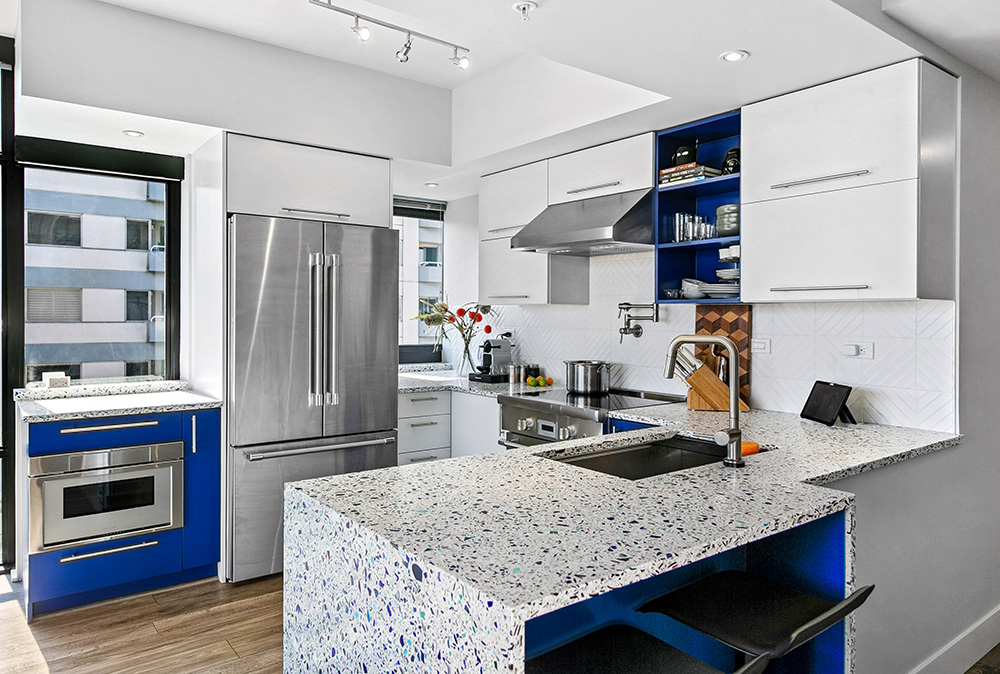 Modern art meets everyday function and Bauhaus meets Pop Art! Creating this kitchen design was exciting, the young couple that owns the condo is fun, out of the box, with slightly rebellious taste. The counter tops are Recycled Glass Stone made in the USA, the point of blue for the cabinet accent color, is bold and will always brighten those typical Seattle grey skies, we added texture with the geometric Walker Zanger 4D Tile on the back splash. It’s playful, but with clean lines and added high end perks like waterfalls at the seating area and pot filler above the stove. Perks: without changing the kitchen footprint, we improved cabinet storage and created a seating area!