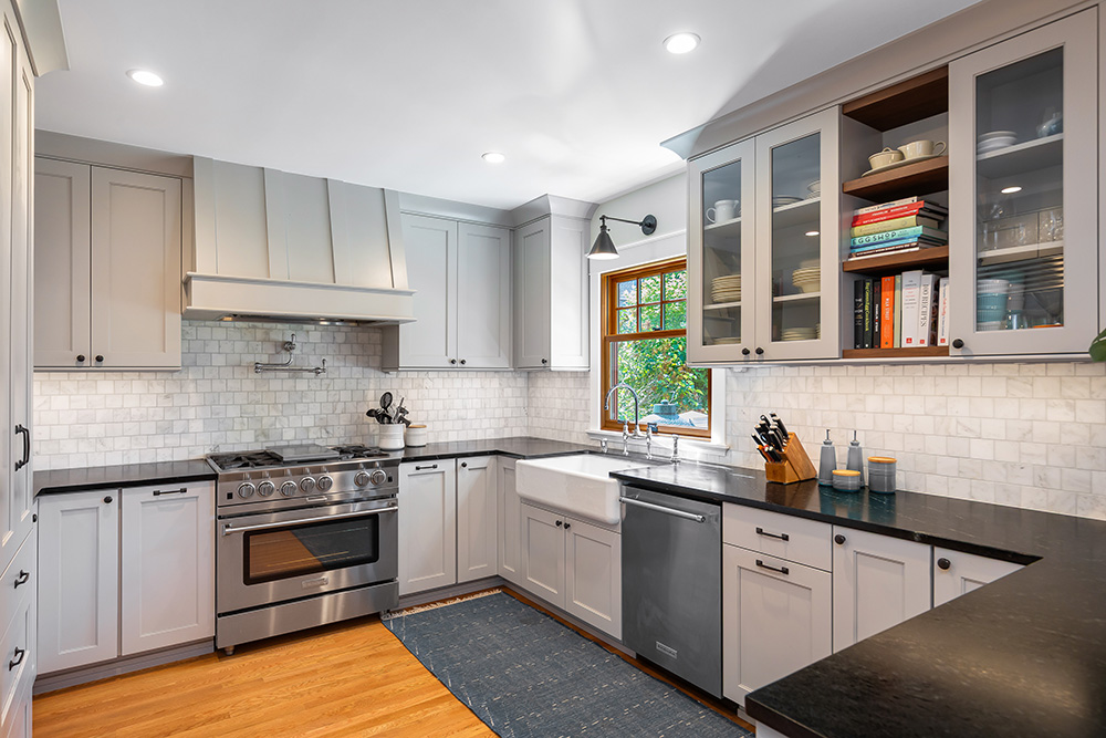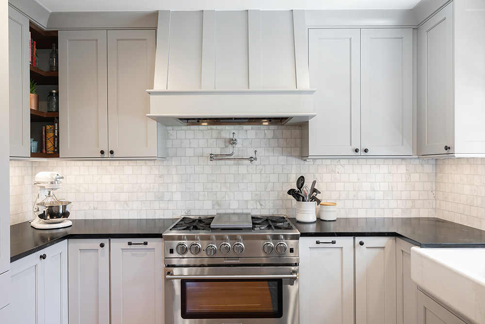 Rich, timeless soapstone counter tops, Tunisian honed white marble custom cut in 3×3, shaker coastal gray cabinets embellish by walnut shelves accent, high end appliances, and pot filler under the hood, this open kitchen is truly a dream to work in. There is endless counter space, a lot of storage in the pantries flanking the subzero, and having the stove and hood centrally located on the main wall enhances the homey feeling. I designed the hood to be simple, yet showing off curated craftsman accents.