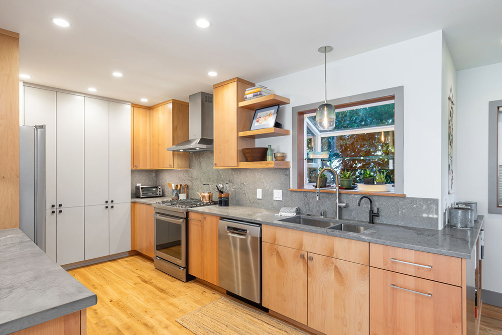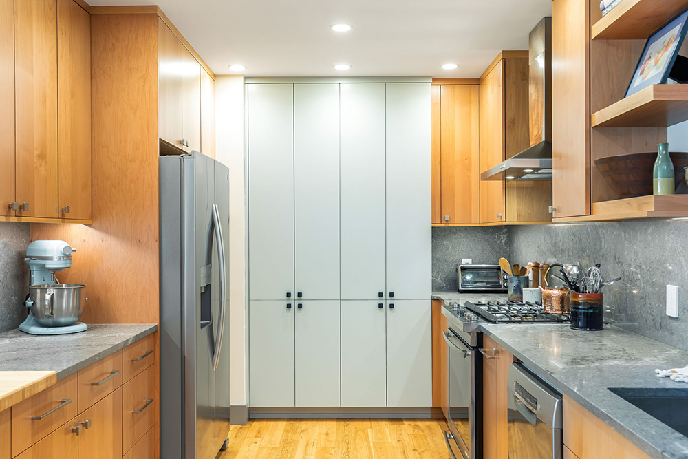 My clients were moving from Oregon to Washington, from a farm in the fields, to a beautiful Seattle lot close to the water. The kitchen was remodeled, without changing any plumbing or gas location. Storage was the main task, so I started right there. The back wall was perfect to add 2 large pantries with 8 doors and all the pull outs and shelves my clients can possibly need. Having the pantries in a different color from the kitchen provided a break from the wood and an airy sensation, for the same reason the bay window was enlarged, and we added open shelves right by it, rather than a full cabinet. We used Caesarstone Quartz on Counters and backsplash, with butcher block work top.